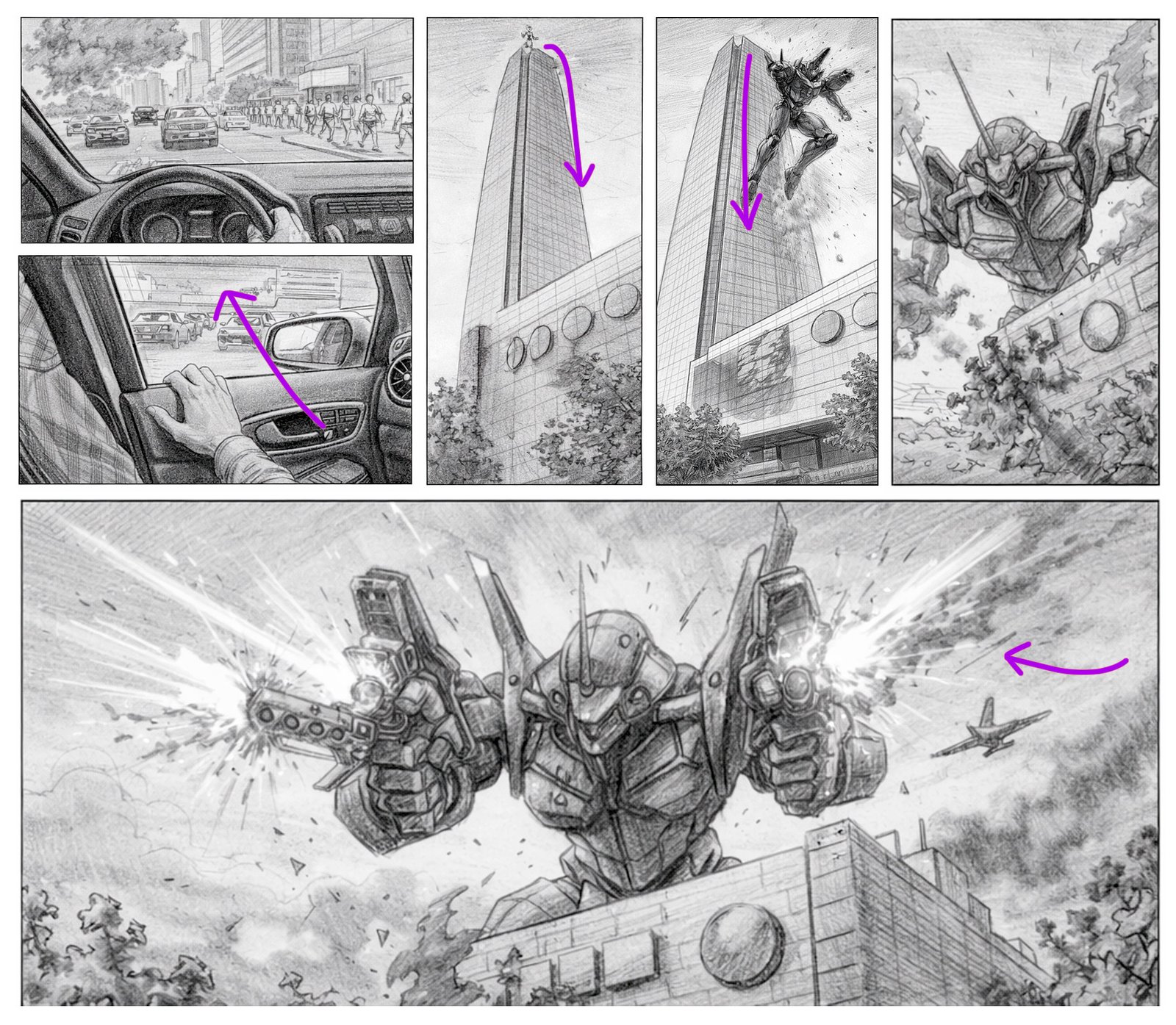 A CGI intervention inspired by the Evangelion universe, where EVA 01 descends from the Costanera Center into the city of Santiago.